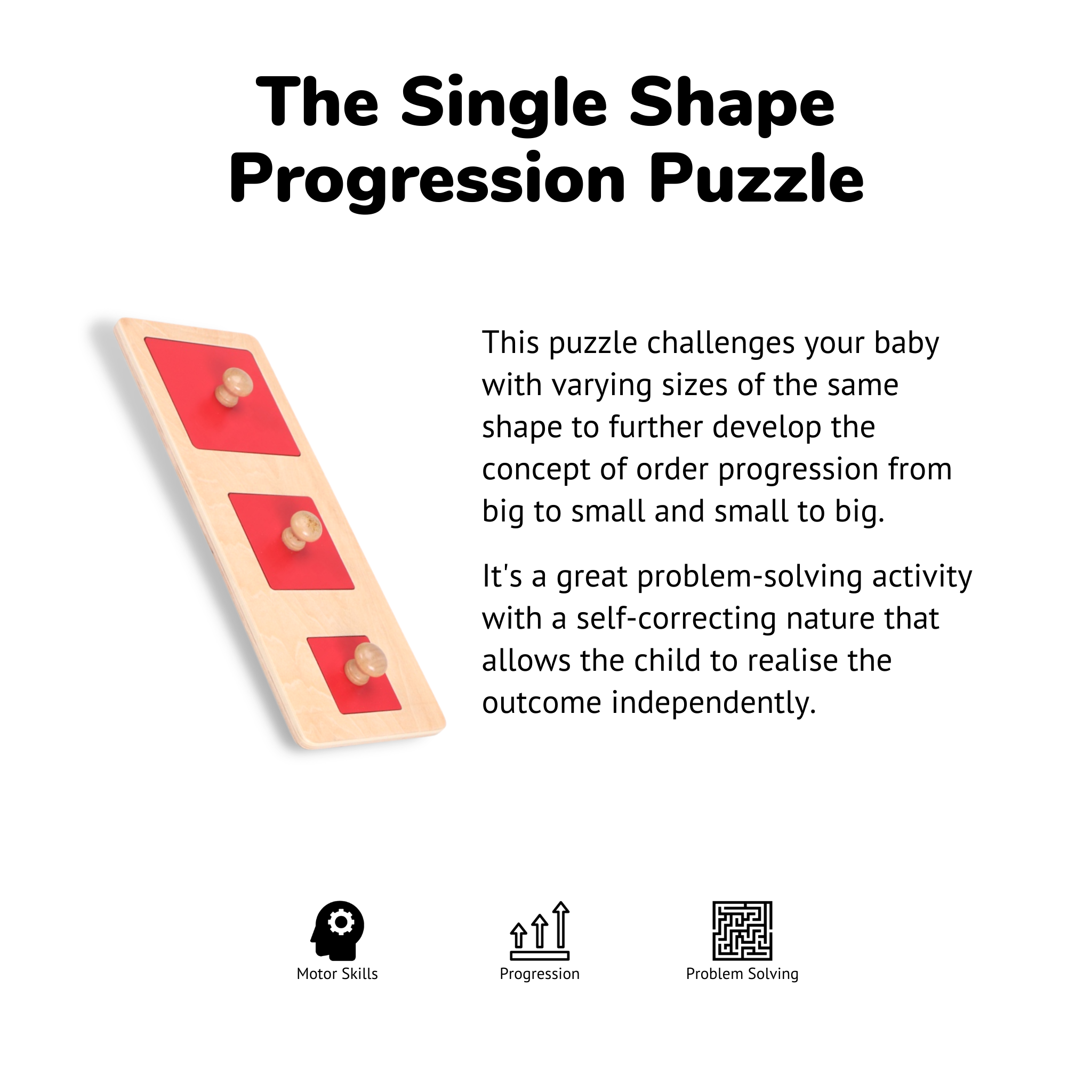 Single Shape Progression Puzzle : Stencil: L - 310mm, B - 120mm, H - 10mm | Big Square: 90mm | Medium Square: 70mm | Small Square: 50mm