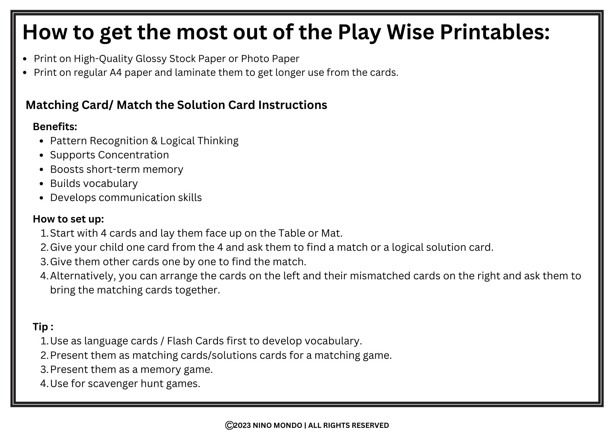 The ideal tool for matching and memory games at home and in the classroom are these ready-to-print matching cards. Utilizing these cards in a game can foster important skill development, such as logical thinking and problem-solving, as players attempt to connect and match different items. Additionally, using the cards for a memory game can help enhance memory skills. Moreover, the social skills of children can improve as they interact in social activities and take turns in the games. These matching cards can also serve as excellent Montessori flashcards.