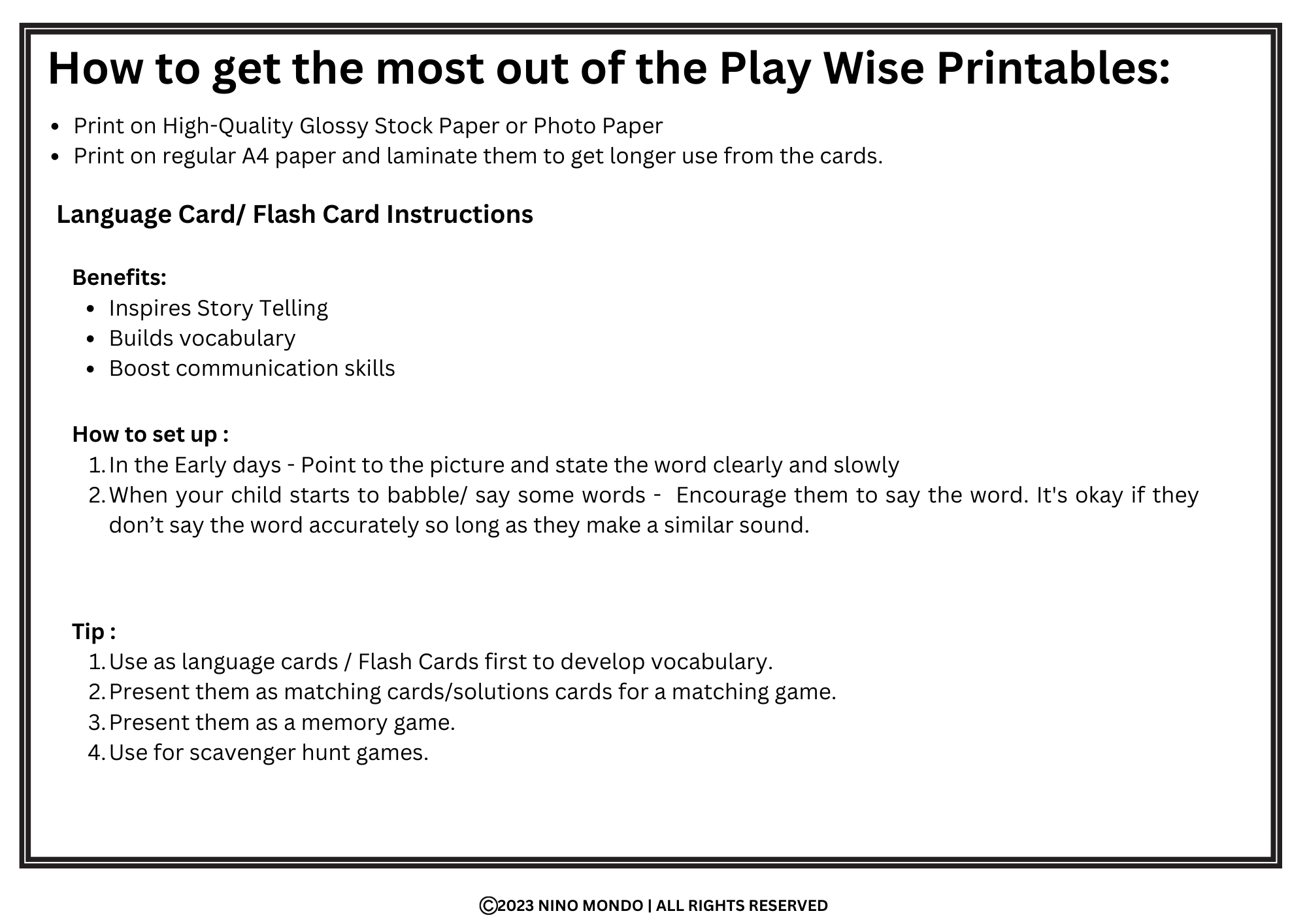 Tip: Use as language cards / Flash Cards first to develop vocabulary. Present them as matching cards/solutions cards for a matching game. Present them as a memory game. Use for scavenger hunt games.
